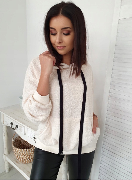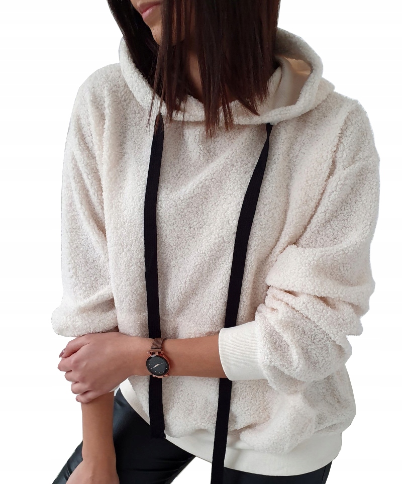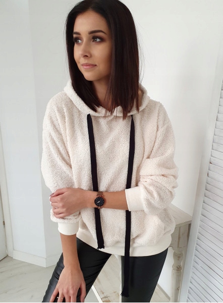 Bluza z kapturem niezwykle ciepła i miękka w dotyku. Wkładana przez głowę, na dole ściągacz. Przy kapturze modne sznurki w kolorze czarnym.