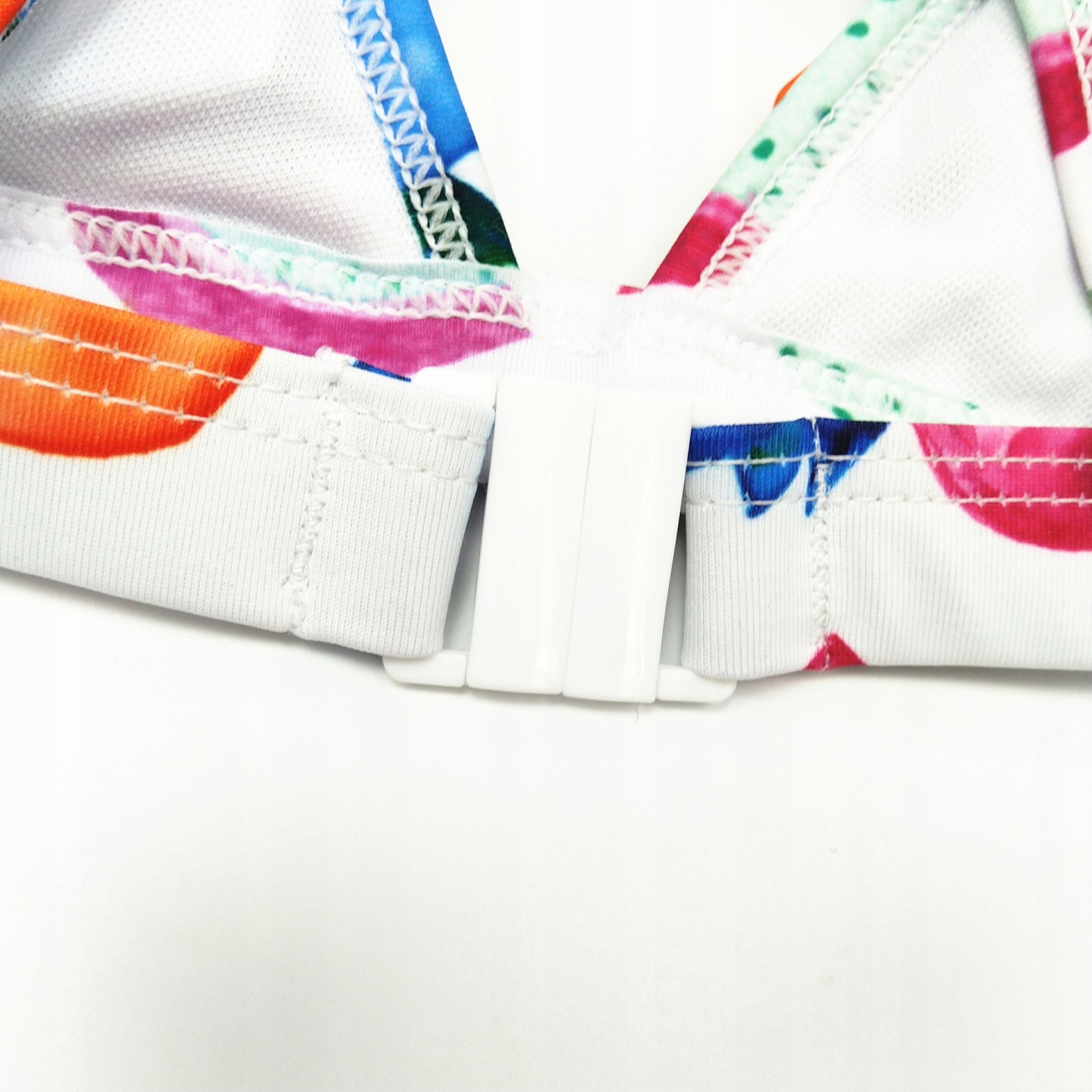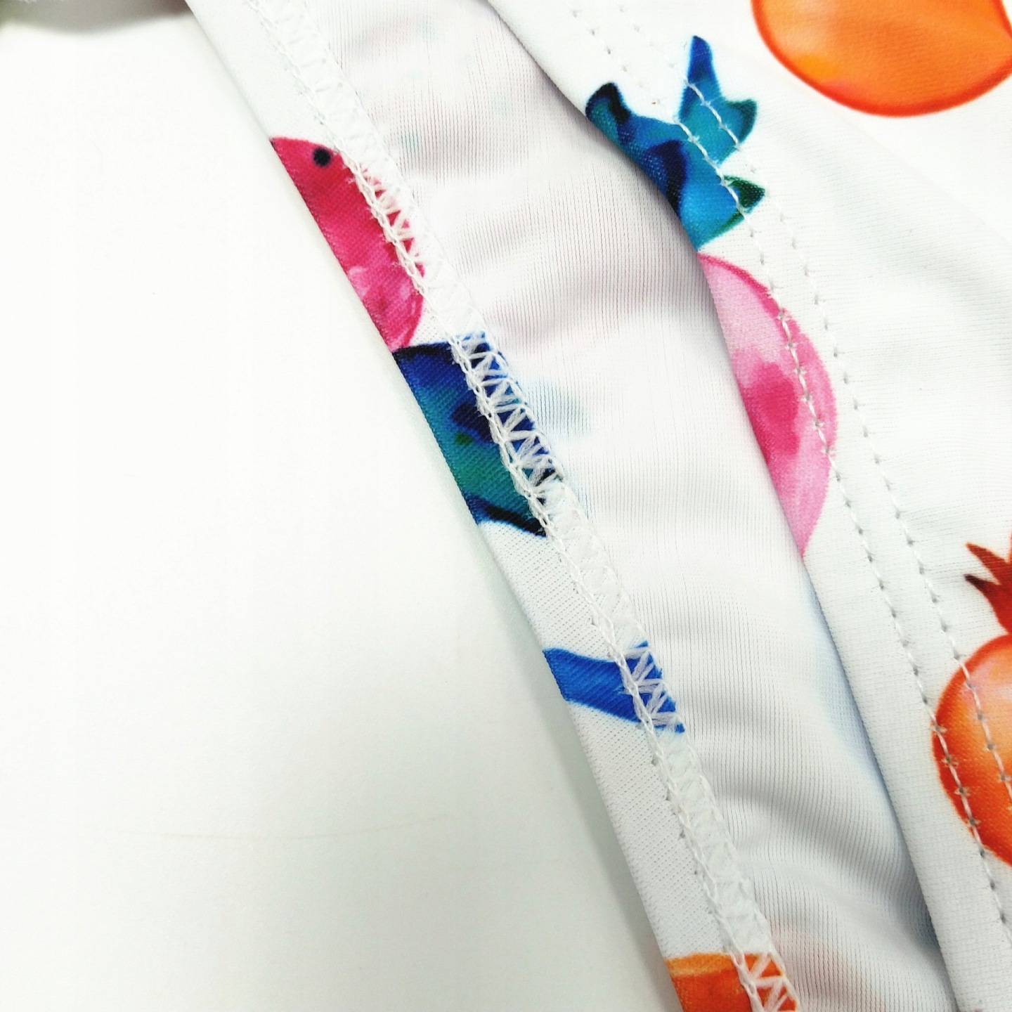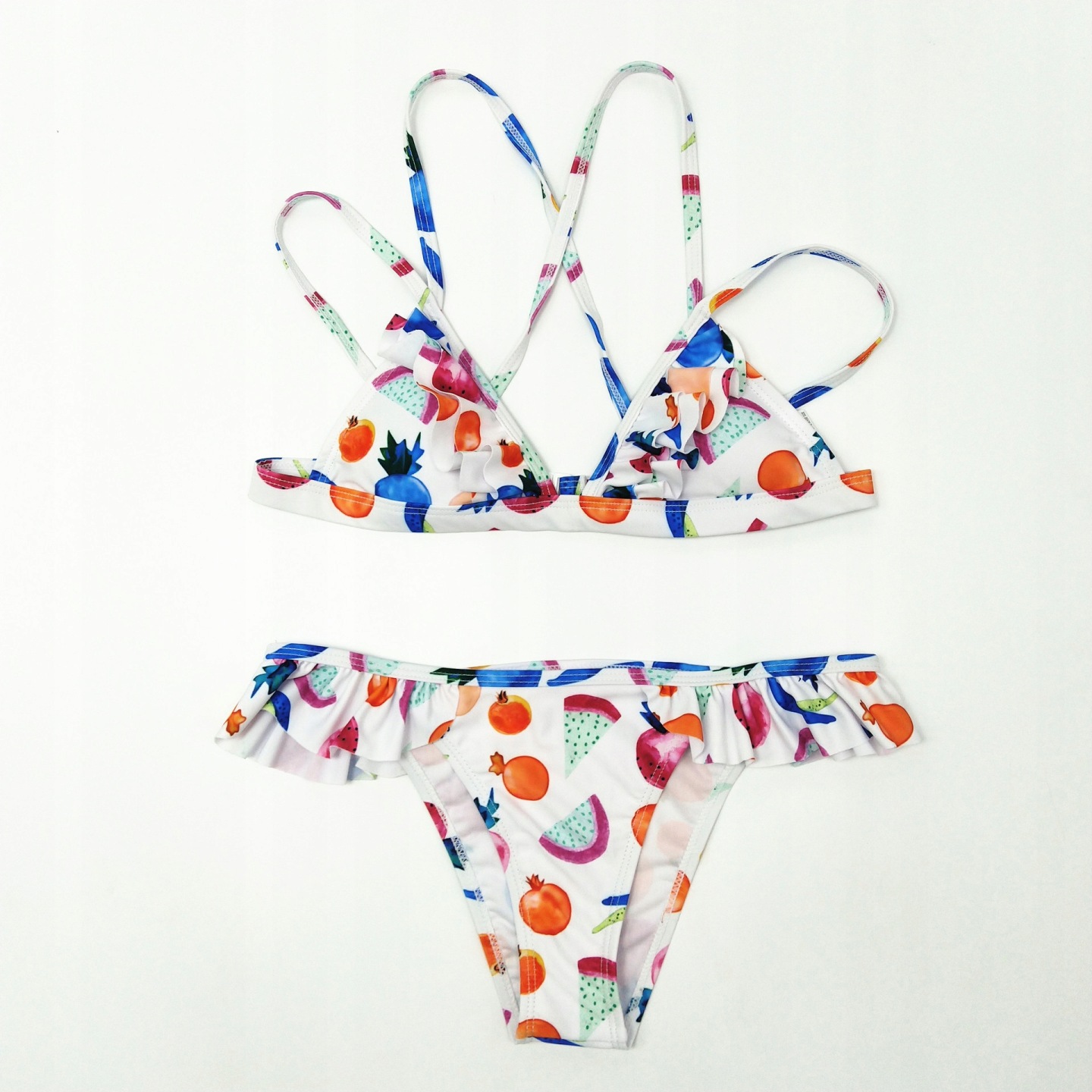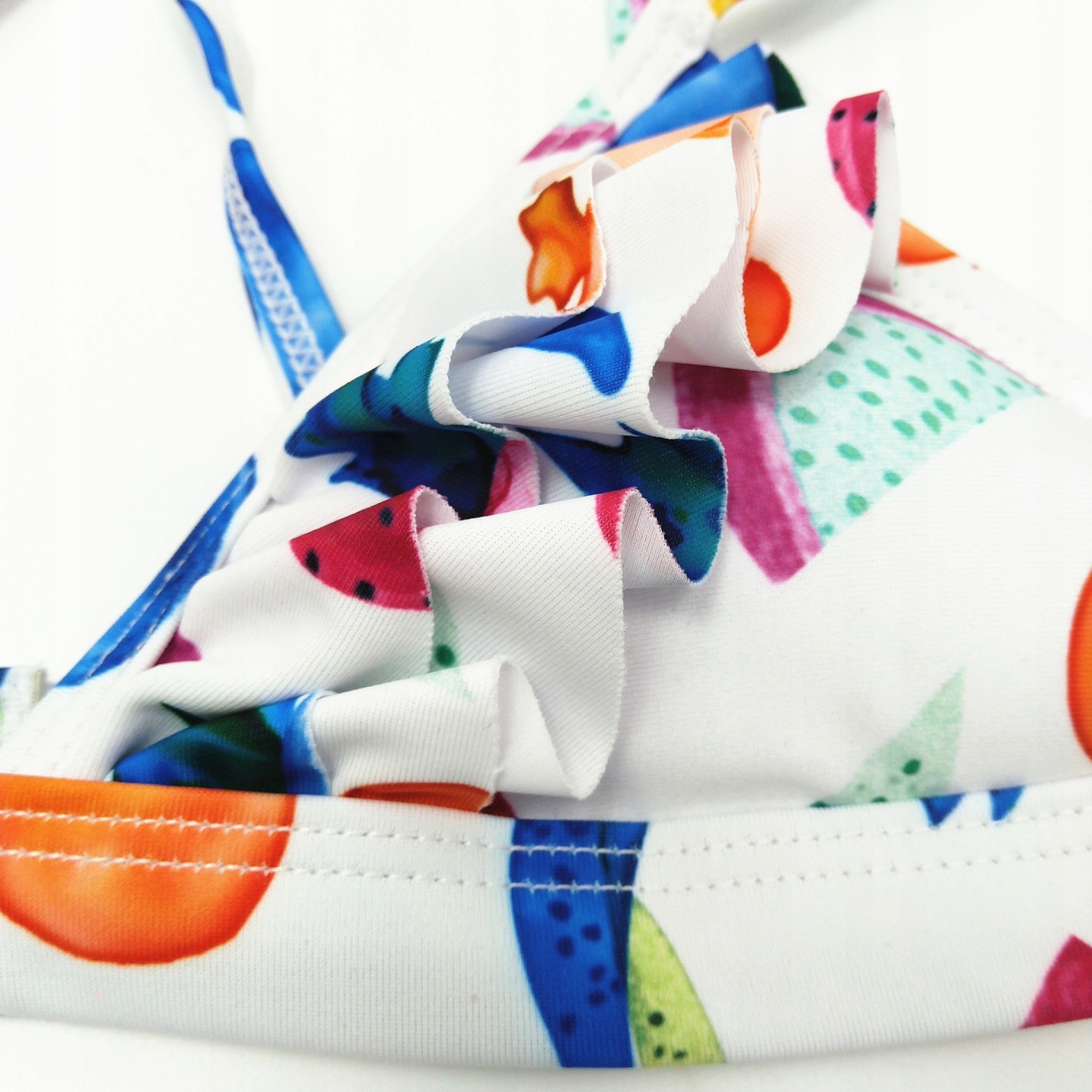 Kobiecy i niezwykle seksowny komplet kąpielowy składający się z biustonosza oraz fig. Oryginalny wzór w owoce pozwoli wyróżnić się na plaży!
