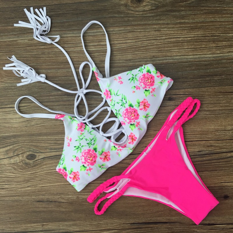 Kobiecy i niezwykle seksowny komplet kąpielowy składający się z biustonosza oraz fig. Najmodniejszy w tym sezonie print w kwiaty!
