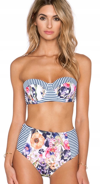 Kobiecy i niezwykle seksowny komplet kąpielowy składający się z biustonosza oraz fig z wysokim stanem. Oryginalny wzór pozwoli wyróżnić się na plaży!
